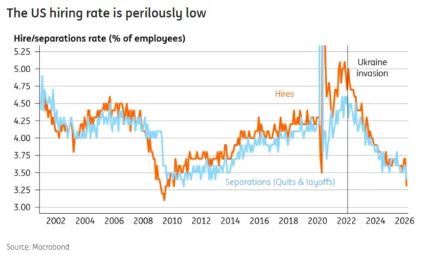 This is the fourth price shock to hit households in five years, arriving amid a slowing labor market. JOLTS data showed hiring declined in February, while job openings and layoffs were steady but low, suggesting the labor market remains in a low-hire, low-fire mode. Markets expect payrolls to rise by 65k in March, similar to the ADP print, and a partial rebound after an unexpected loss of 92k jobs in February. While not yet signaling a sharp deterioration, a cooling labor market leaves households more exposed to negative shocks.