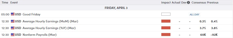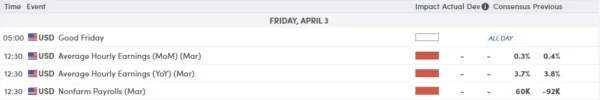 - US nonfarm payrolls for March 2026 – Forecast 60K, versus -92K previous.