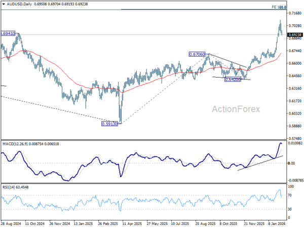 Intraday bias in AUD/USD stays neutral for consolidations below 0.7093. Risk will stay on the upside as long as 55 4H EMA (now at 0.6914) holds. Above 0.7093 will extend larger up trend to 100% projection of 0.5913 to 0.6706 from 0.6420 at 0.7213 next. Nevertheless, break of 55 4H EMA will confirm short term topping, and bring lengthier consolidations before rally resumption.