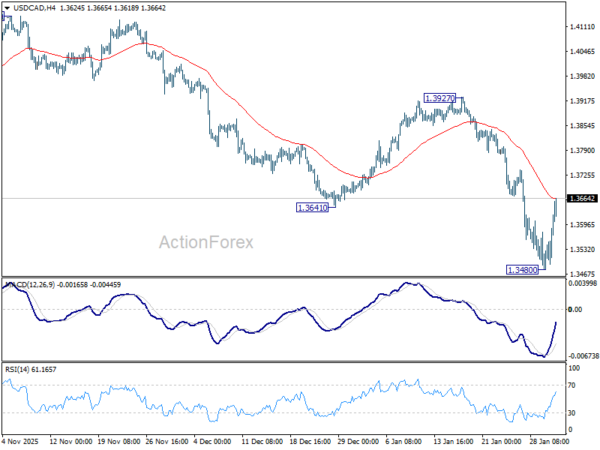 Intraday bias in USD/CAD is turned neutral with current recovery and some consolidations would be seen above 1.3480. Further decline is in favor as long as 55 4H EMA (now at 1.3664) holds. Below 1.3480 will target 61.8% projection of 1.4791 to 1.3538 from 1.4139 at 1.3365. However, firm break of 55 4H EMA will indicate short term bottoming, and bring stronger rebound towards 55 D EMA (now at 1.3805) instead.