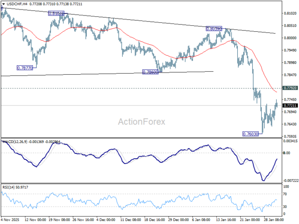 Intraday bias in USD/CHF remains neutral and more consolidations could be seen above 0.7603. With 0.7792 resistance intact, outlook remains bearish. On the downside, break of 0.7603 will resume the larger down trend to 0.7382 projection level next. However, firm break of 0.7792 will turn bias back to the upside, for stronger rebound to 0.7860 support turned resistance and above.
