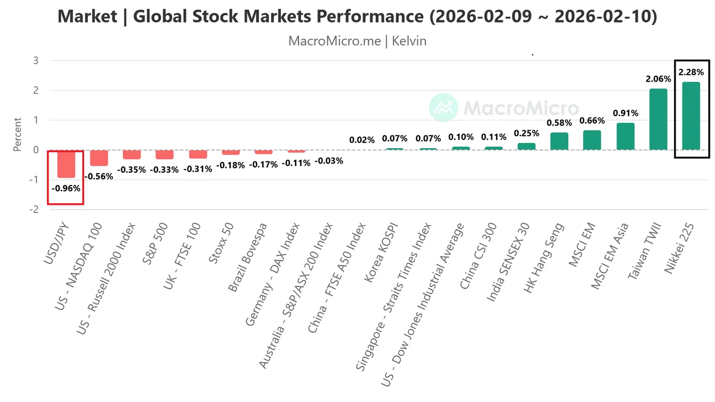 Fig. 1: Global stock market indices with USD/JPY from 9 Feb to 10 Feb 2026 (Source: MacroMicro)