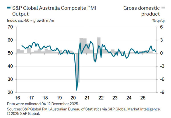 Australia’s PMI readings for December pointed to moderating growth momentum toward year-end. PMI Manufacturing rose from 51.6 to 52.2, signaling a stronger expansion in factory activity. PMI Services slipped from 52.8 to 51.0. As a result, PMI Composite eased from 52.6 to 51.1, the lowest level in seven months.