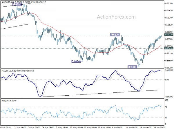 AUD/USD’s rebound from 0.6831 extended higher last week and is now pressing 0.7022 resistance. At this point, we’d still expect rejection from 0.7022 to complete the rebound. On the downside, break of 0.6941 minor support will turn bias back to the downside for retesting 0.6831 low. However, firm break of 0.7022 will indicate near term bullish reversal and turn outlook bullish for 0.7205 resistance next.