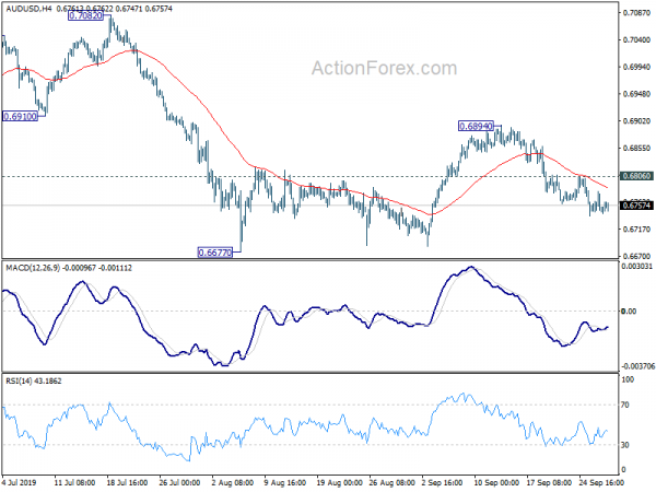 In the bigger picture, decline from 0.8135 (2018 high) is seen as resuming the long term down trend from 1.1079 (2011 high). Next target is 0.6008 (2008 low). On the upside, break of 0.7082 resistance is needed to be the first sign of medium term bottoming. Otherwise, outlook will remain bearish even in case of strong rebound.