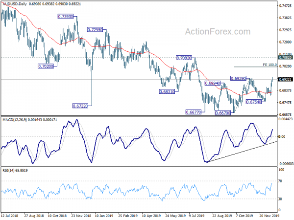 AUD/USD’s breach of 0.6929 resistance suggests resumption of whole rise form 0.6670. Intraday bias stays on the upside for 100% projection of 0.6670 to 0.6929 from 0.6754 at 0.7013 next. On the downside, below 0.6878 minor support will turn intraday bias neutral first. But risk will stays on the upside as long as 0.6800 support holds.