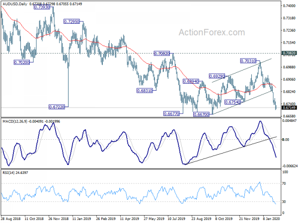 Intraday bias in AUD/USD remains on the downside at this point. Further decline should be seen to retest 0.6670 low next. On the upside, above 0.6777 minor resistance will turn intraday bias neutral first. But recovery should be limited below 0.6849 support turned resistance to bring another fall.