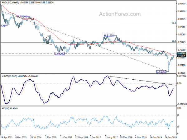 In the bigger picture, while the rebound from 0.5506 is stronger than expected, we’re seeing it as corrective the fall from 0.8135 only (2018 high) to 0.5506. Strong resistance should be seen from 0.6826 (2016 low) to limit upside. However, sustained break of 0.6826 will argue that rise from 0.5506 is at least corrective the fall from 1.1079 (2011 high). Stronger rally would be seen to 55 month EMA (now at 0.7365).
