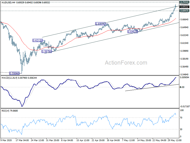AUD/USD’s rally accelerates to as high as 0.6983 so far. There is no sign of topping yet and intraday bias stays on the upside for 0.7031 resistance. On the downside, break of 0.6847 minor support will turn intraday bias neutral first. But near term outlook will stays bullish as long as 0.6569 resistance turned support holds, in case of retreat.