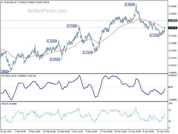 Intraday bias in AUD/USD is turned neutral again as it recovered after hitting 0.7342. On the upside, break of 0.7492 minor resistance will turn bias back to the upside for 0.7660. Firm break there will resume larger rise from 0.6991 to retest 0.8006 high. On the downside, below 0.7342 will target 0.7164 support.