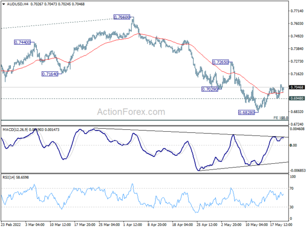 Intraday bias in AUD/USD is mildly on the upside at this point. Rebound from 0.6828 short term bottom would target 55 day EMA (now at 0.7187). On the downside, below 0.6948 minor support will bring retest of 0.6828 support first. Firm break there will resume larger fall from 0.8006, and target 0.6756/60 medium term fibonacci level next.