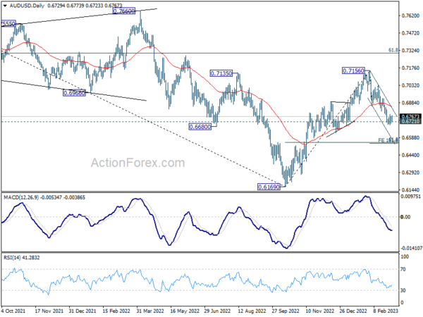 In the bigger picture, focus is staying on 0.6721 structural support. Sustained break there will argue that whole rise from 0.6169 (2022 low) has completed at 0.7156, after rejection by 55 month EMA (now at 0.7164). Deeper decline would then be see back to 61.8% retracement of 0.6169 to 0.7156 at 0.6546, even as a corrective fall. Nevertheless, strong rebound from current level will retain medium term bullishness for another rise through 0.7156 later.