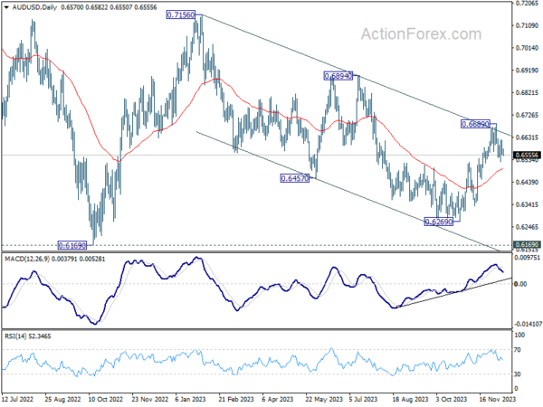 Intraday bias in AUD/USD remains neutral for the moment. Risk will stay on the downside as long as 0.6689 resistance holds. Break of 0.6524 will resume the fall from 0.6689 short term top to 55 D EMA (now at 0.6496). Nevertheless, firm break of 0.6689 will resume the rise from 0.6269 instead.