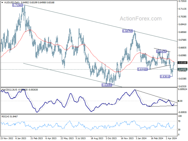 Intraday bias in AUD/USD remains on the upside for the moment. Sustained break of 55 D EMA (now at 0.6527) will argue that fall from 0.6870 has completed, and bring further rally to 0.6643 resistance next. On the downside, though, break of 0.6440 minor support will indicate rejection by 55 D EMA and retain near term bearishness. Retest of 0.6361 low should be seen next.