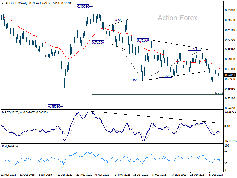 In the bigger picture, fall from 0.6941 (2024 high) is seen as part of the down trend from 0.8006 (2021 high). Next medium term target is 61.8% projection of 0.8006 to 0.6169 from 0.6941 at 0.5806. However, sustained trading above 55 W EMA (now at 0.6446) will argue that a medium term bottom was already formed, and set up further rebound to 0.6941 resistance instead.