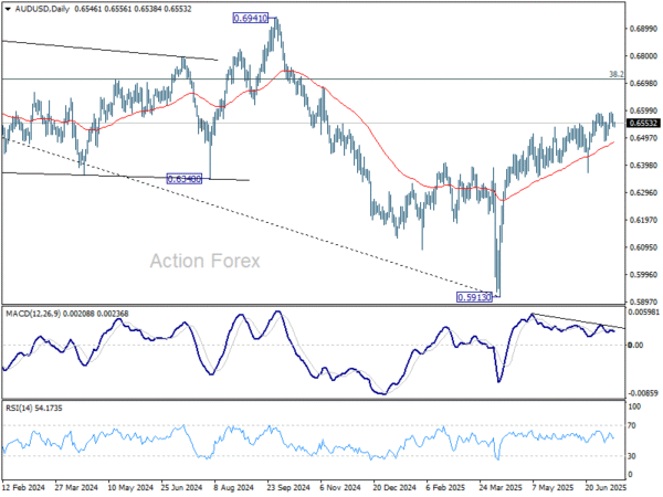 Intraday bias in AUD/USD remains neutral and more consolidations would be seen below 0.6594. Further rise is expected as long as 0.6484 support holds. Above 0.6594 will resume the rally from 0.5913 and target 0.6713 fibonacci level.