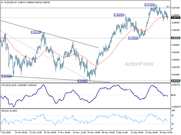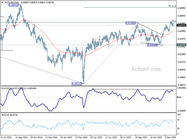 Intraday bias in AUD/USD stays neutral as consolidations continue below 0.6726. With 0.6592 support intact, further rally is expected. On the upside, sustained trading above 0.6713 fibonacci level will carry larger bullish implications. Next near term target will be 61.8% projection of 0.5913 to 0.6706 from 0.6420 at 0.6910.
