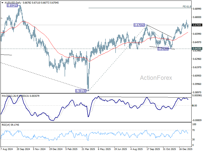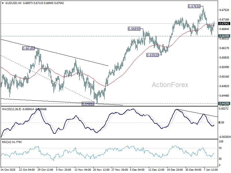 Intraday bias in AUD/USD remains neutral as consolidations continues below 0.6765. Further rally is in favor with 0.6659 support intact. On the upside, break of 0.6765 will resume the whole rise from 0.5913 and target 61.8% projection of 0.5913 to 0.6706 from 0.6420 at 0.6910. However, considering bearish divergence condition in 4H MACD, firm break of 0.6659 will confirm short term topping, and bring deeper correction back towards 0.6592 support.