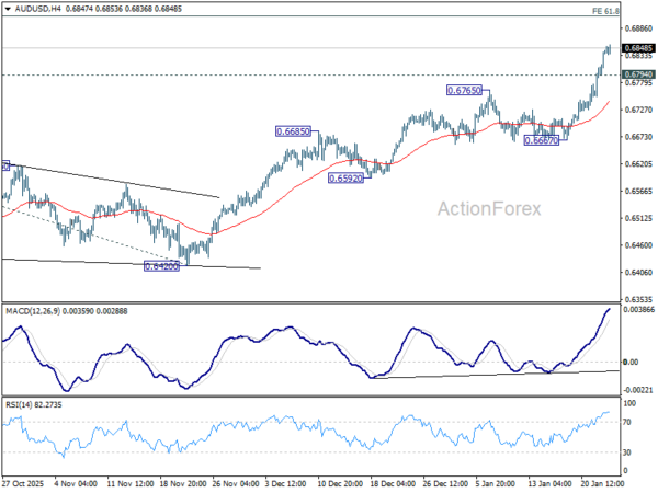 AUD/USD’s rally continues today and and intraday bias stays on the upside. Next target is 61.8% projection of 0.5913 to 0.6706 from 0.6420 at 0.6910. On the downside, below 0.6794 minor support will turn intraday bias neutral and bring consolidations. But pullback should be contained above 0.6667 support to bring another rally.