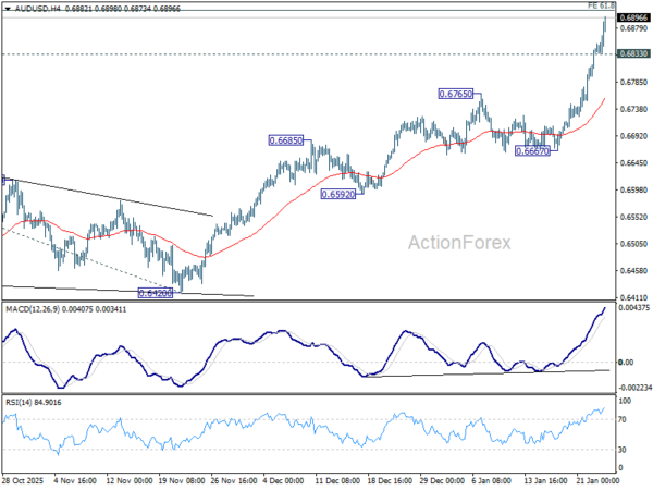 AUD/USD’s up trend from 0.5913 resumed last week and accelerated higher. Initial bias stays on the upside this week for 61.8% projection of 0.5913 to 0.6706 from 0.6420 at 0.6910. Firm break there will pave the way to 100% projection at 0.7213. On the downside, below 0.6833 minor support will turn intraday bias neutral and bring consolidations first. But downside of retreat should be contained well above 0.6667 support to bring another rally.