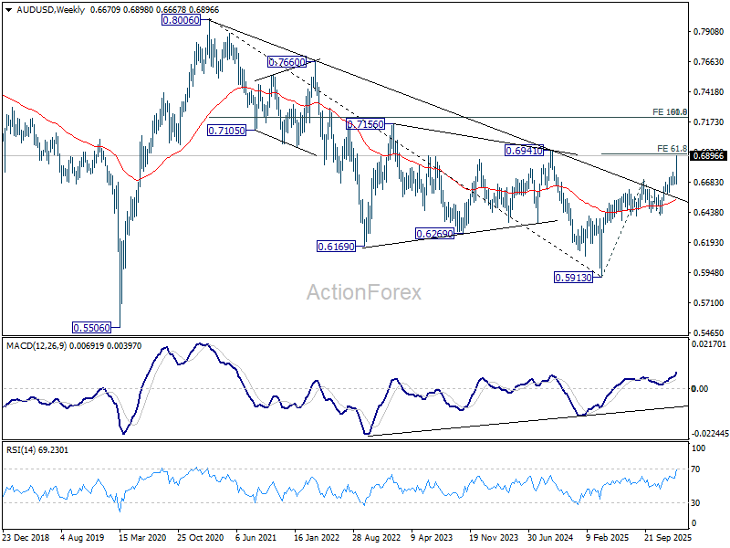 In the bigger picture, current development argues that rise from 0.5913 (2024 low) is reversing whole down trend from 0.8006 (2021 high). Further rally should be seen to 61.8% retracement of 0.8006 to 0.5913 at 0.7206. This will remain the favored case as long as 0.6420 support holds, even in case of deep pullback.