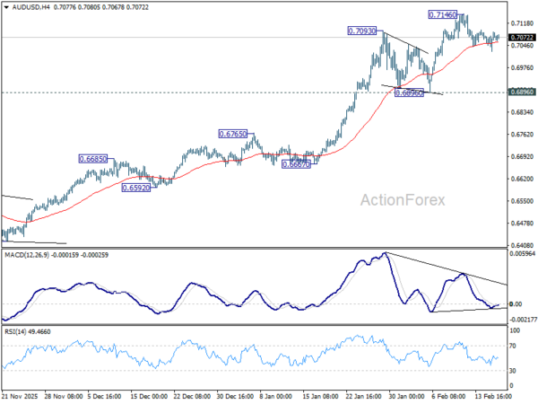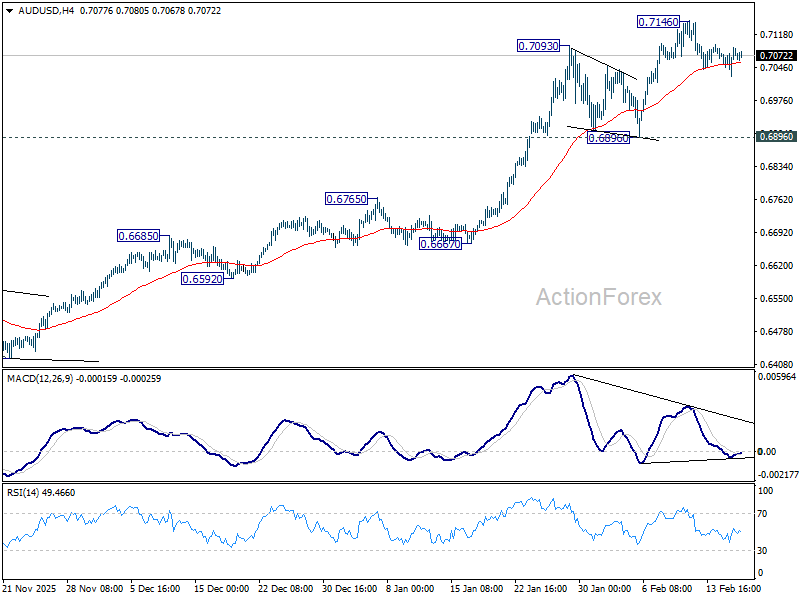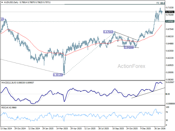 AUD/USD is extending consolidations from 0.7146 and intraday bias remains neutral. Deeper retreat might be seen, but downside should be contained above 0.6896 support to bring another rally. On the upside, above 0.7146 will resume larger up trend to 100% projection of 0.5913 to 0.6706 from 0.6420 at 0.7213.