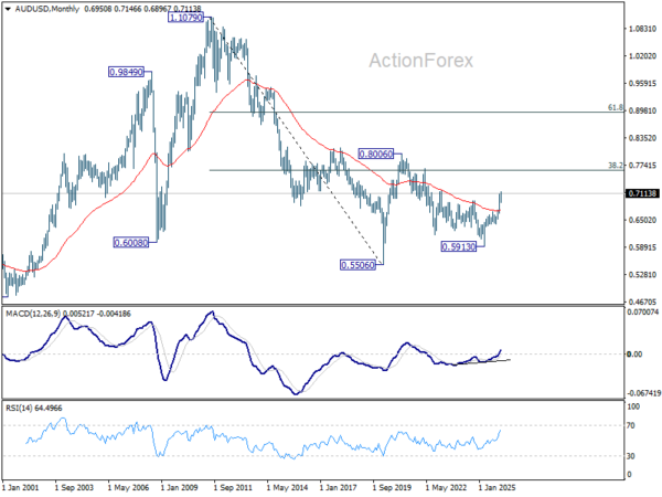 In the bigger picture, current development argues that rise from 0.5913 (2024 low) is reversing whole down trend from 0.8006 (2021 high). Further rally should be seen to 61.8% retracement of 0.8006 to 0.5913 at 0.7206. This will remain the favored case as long as 0.6706 resistance turned support holds, even in case of deep pullback.