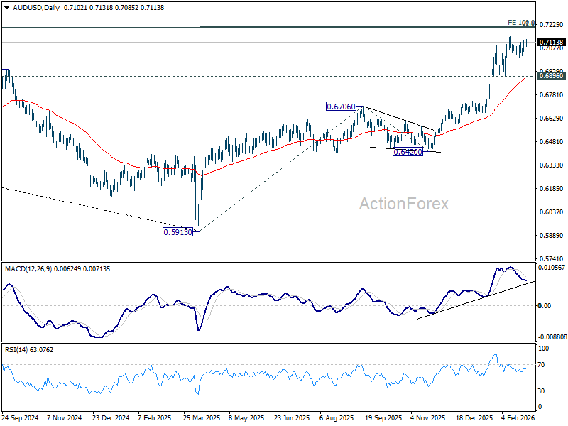 AUD/USD remained bounded in consolidations below 0.7146 last week and outlook is unchanged. Further rise is expected with 0.6896 support intact. On the upside, firm break of 0.7146 will resume resume larger up trend to 100% projection of 0.5913 to 0.6706 from 0.6420 at 0.7213.