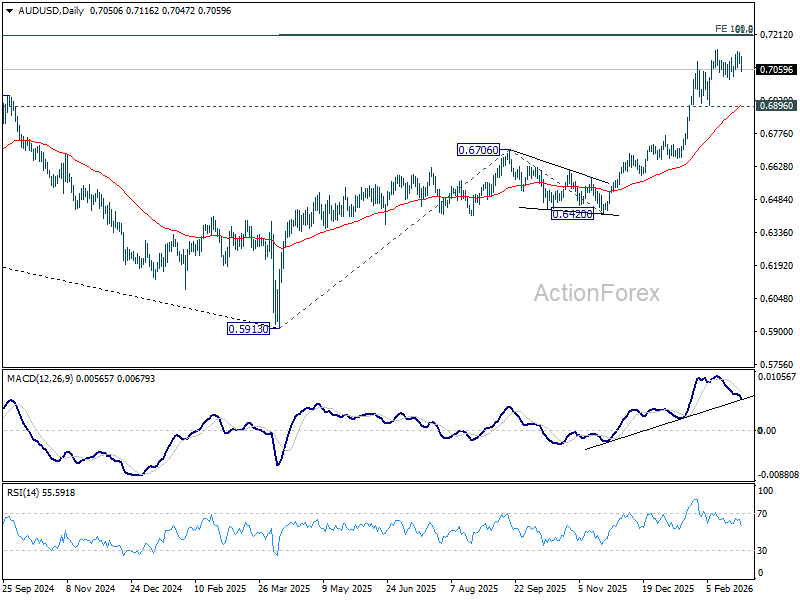 Range trading continues in AUD/USD and intraday bias stays neutral at this point. Further rise is expected with 0.6896 support intact. On the upside, firm break of 0.7146 will resume resume larger up trend to 100% projection of 0.5913 to 0.6706 from 0.6420 at 0.7213.