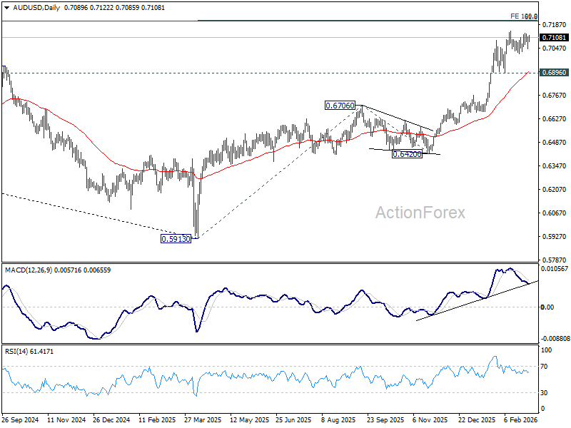 AUD/USD is still bounded in sideway trading and intraday bias stays neutral. Further rise is expected with 0.6896 support intact. On the upside, firm break of 0.7146 will resume resume larger up trend to 100% projection of 0.5913 to 0.6706 from 0.6420 at 0.7213.