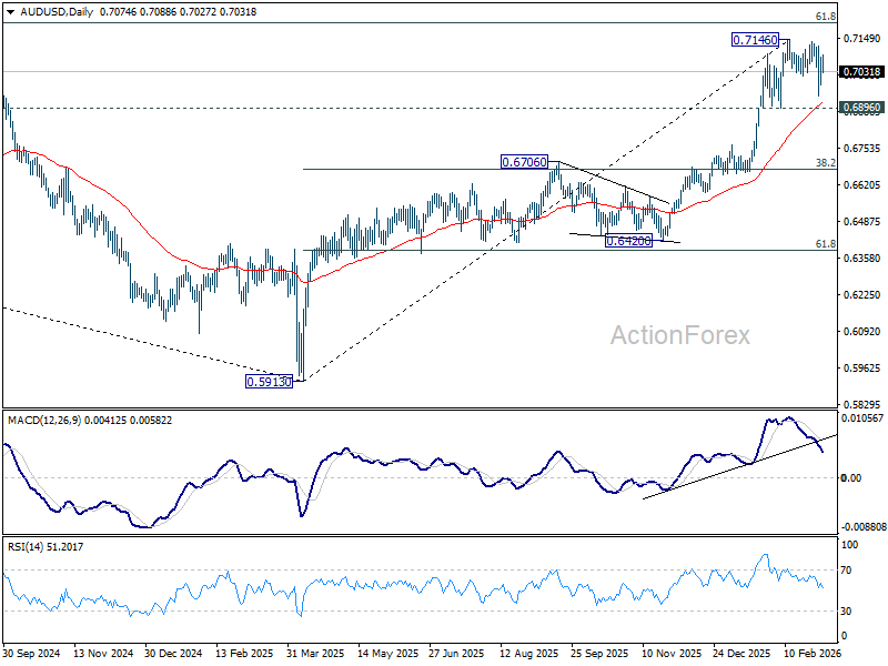 AUD/USD rebounded notably but stays in established range below 0.7146. Intraday bias remains neutral and more consolidations could be seen. Further rally is still in favor with 0.6896 support intact. On the upside, firm break of 0.7146 will resume resume larger up trend 0.7206 fibonacci level. However, firm break of 0.6896 will indicate that a larger scale correction is underway, and target 38.2% retracement of 0.5913 to 0.7146 at 0.6675.