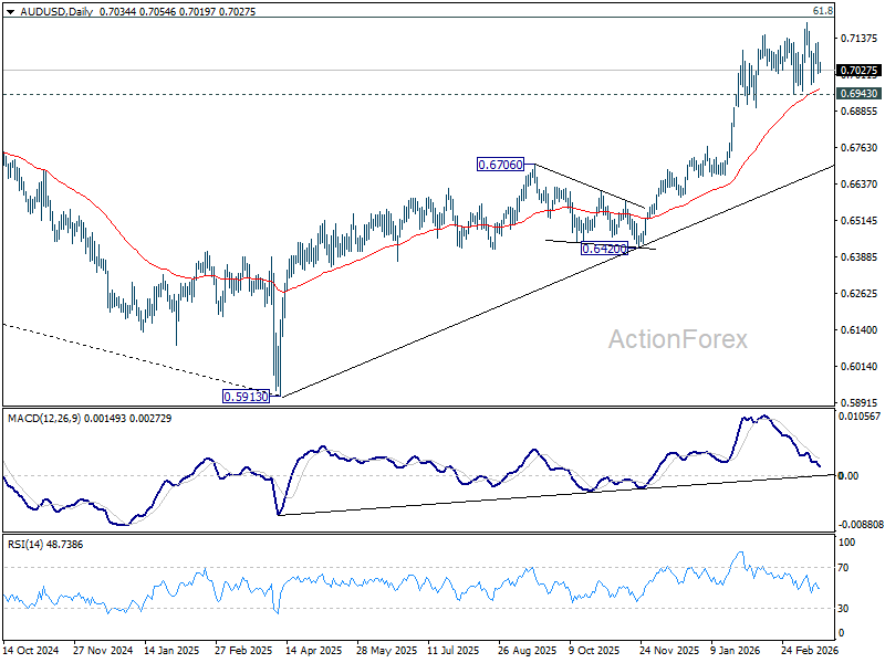 Sideway trading continues in AUD/USD and intraday bias remains neutral at this point. With 0.6943 support intact, further rally is still expected. On the upside, firm break of 100% projection of 0.5913 to 0.6706 from 0.6420 at 0.7213 could prompt upside acceleration to 161.8% projection at 0.7703. However, firm break of 0.6943 will indicate that a larger scale correction is already underway.