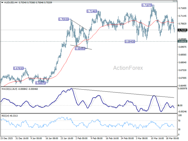 AUD/USD remained bounded in established range last week and outlook is unchanged. Initial bias stays neutral this week. With 0.6943 support intact, further rally is still expected. On the upside, firm break of 100% projection of 0.5913 to 0.6706 from 0.6420 at 0.7213 could prompt upside acceleration to 161.8% projection at 0.7703. However, firm break of 0.6943 will indicate that a larger scale correction is already underway.