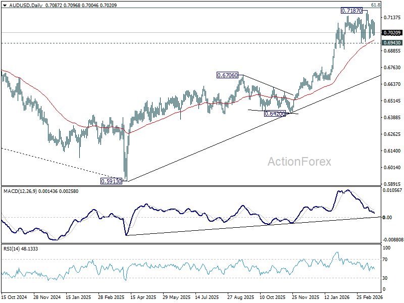 AUD/USD remained bounded in established range last week and outlook is unchanged. Initial bias stays neutral this week. With 0.6943 support intact, further rally is still expected. On the upside, firm break of 100% projection of 0.5913 to 0.6706 from 0.6420 at 0.7213 could prompt upside acceleration to 161.8% projection at 0.7703. However, firm break of 0.6943 will indicate that a larger scale correction is already underway.