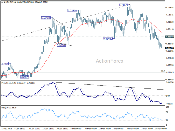 AUD/USD’s extended decline last week should confirm medium term topping at 0.7187. Initial bias remains on the downside this week for 38.2% retracement of 0.5913 to 0.7187 at 0.6700. On the upside, above 0.6956 minor resistance will turn intraday bias neutral first. But risk will stay on the downside as long as 0.7187 resistance holds, in case of recovery.