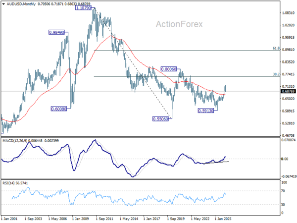 In the bigger picture, as long as 0.6706 cluster support holds, rise from 0.5913 (2024 low) should still be in progress. Decisive break of 61.8% retracement of 0.8006 to 0.5913 at 0.7206 will solidify the case that it’s already reversing the down trend from 0.8006 (2021 high). However, firm break of 0.6706 will dampen this bullish case, and bring deeper fall back to 0.6420 support, and possibly below.