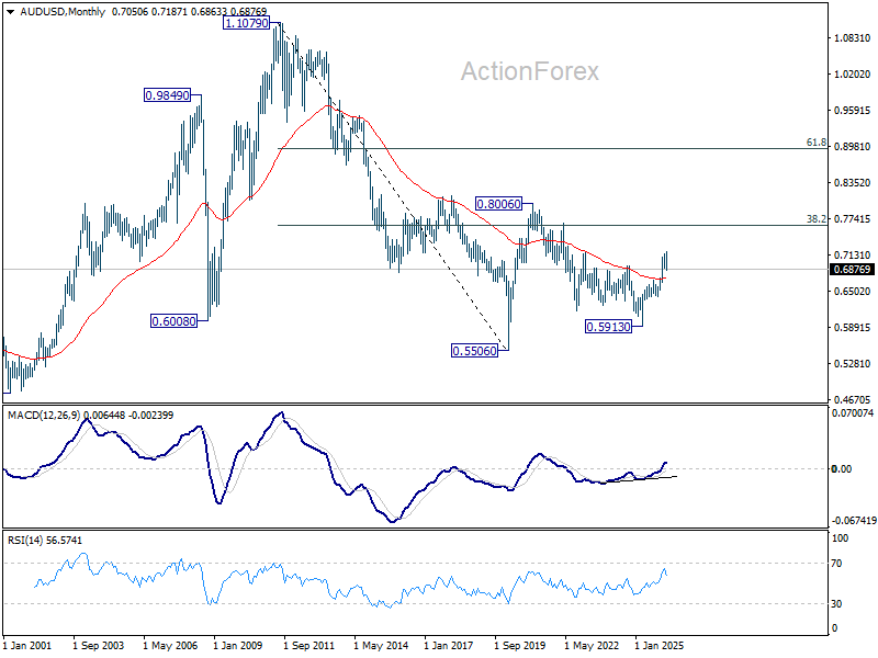 In the bigger picture, as long as 0.6706 cluster support holds, rise from 0.5913 (2024 low) should still be in progress. Decisive break of 61.8% retracement of 0.8006 to 0.5913 at 0.7206 will solidify the case that it’s already reversing the down trend from 0.8006 (2021 high). However, firm break of 0.6706 will dampen this bullish case, and bring deeper fall back to 0.6420 support, and possibly below.