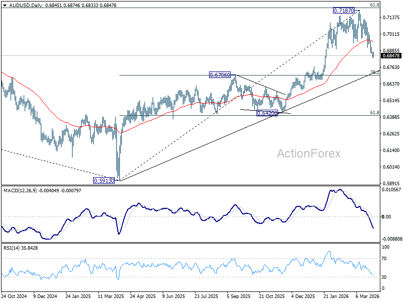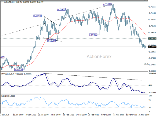 Intraday bias in AUD/USD remains on the downside at this point. Current fall from 0.7187 should target retracement of 0.5913 to 0.7187 at 0.6700. On the upside, above 0.6911 minor resistance will turn intraday bias neutral first. But risk will stay on the downside as long as 0.7187 resistance holds, in case of recovery.