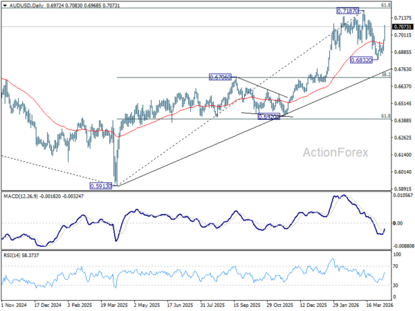 AUD/USD’s strong rally today indicates that corrective fall from 0.7187 has already completed at 0.6832. Intraday bias is back on the upside for retesting 0.7187 high. Strong resistance could be seen there to bring another fall the extend the corrective pattern. On the downside, below 0.6962 resistance turned support will turn intraday bias neutral again first.