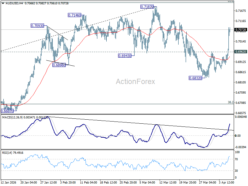 AUD/USD’s strong rally today indicates that corrective fall from 0.7187 has already completed at 0.6832. Intraday bias is back on the upside for retesting 0.7187 high. Strong resistance could be seen there to bring another fall the extend the corrective pattern. On the downside, below 0.6962 resistance turned support will turn intraday bias neutral again first.