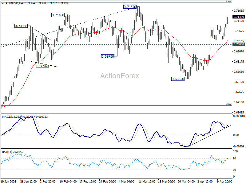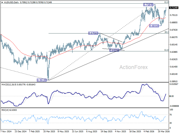Intraday bias in AUD/USD stays on the upside for retesting 0.7187 high. Strong resistance could be seen there on first attempt. But for now, further rally is expected as long as 0.7000 support holds, in case of retreat. Meanwhile, decisive break of 0.7187 will confirm larger up trend resumption.