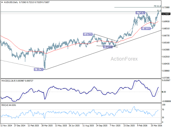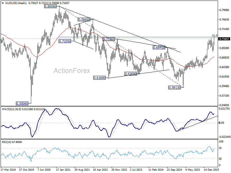 AUD/USD’s up trend resumed by breaking through 0.7187 last week. Initial bias stays on the upside this week for 61.8% projection of 0.6420 to 0.7187 from 0.6832 at 0.7306. On the downside, below 0.7151 minor support will turn intraday bias neutral and bring consolidations first, before staging another rise.