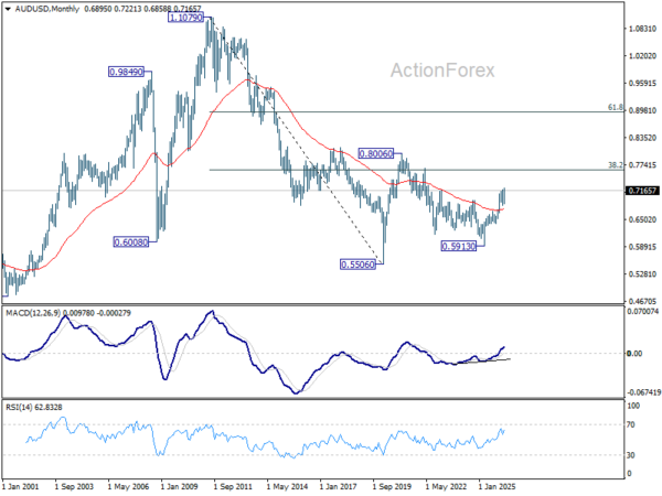 In the bigger picture, rise from 0.5913 (2024 low) is still in progress. Decisive break of 61.8% retracement of 0.8006 to 0.5913 at 0.7206 will solidify the case that it’s already reversing the down trend from 0.8006 (2021 high). Further rally should then be seen to retest 0.8006. For now, outlook will remain bullish as long as 0.6832 support holds, in case of pullback.