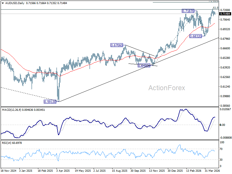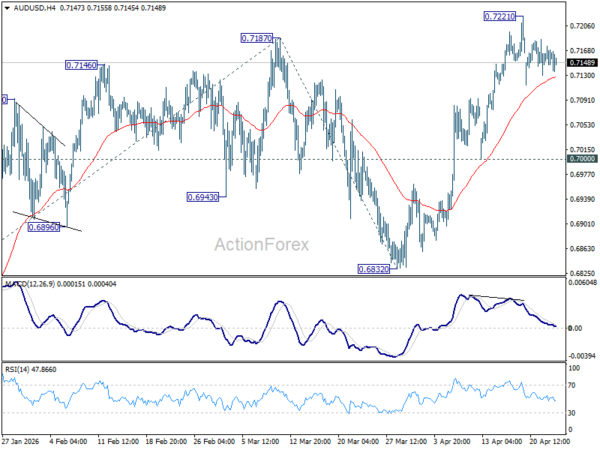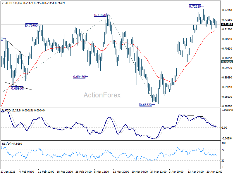 Intraday bias in AUD/USD remains neutral and more consolidations would be seen below 0.7221 temporary top. In case of deeper retreat, downside should be contained above 0.7000 support to bring rebound. On the upside, above 0.7221 will extend the larger up trend to 61.8% projection of 0.6420 to 0.7187 from 0.6832 at 0.7306. However, break of 0.7000 will bring deeper fall back to 0.6832 support instead.