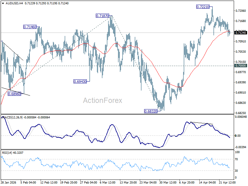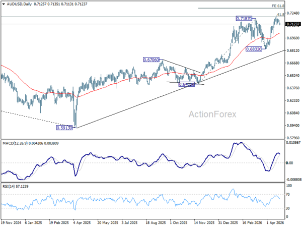 No change in AUD/USD’s outlook. Intraday bias stays neutral, and more consolidations would be seen below 0.7221 temporary top. In case of deeper retreat, downside should be contained above 0.7000 support to bring rebound. On the upside, above 0.7221 will extend the larger up trend to 61.8% projection of 0.6420 to 0.7187 from 0.6832 at 0.7306. However, break of 0.7000 will bring deeper fall back to 0.6832 support instead.