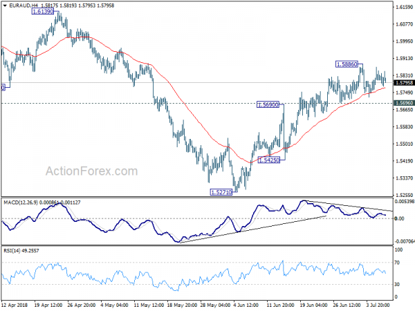 EUR/AUD edged high to 1.5886 last week but turned sideway since then. Initial bias remains neutral this week for some consolidations first. As long as 1.5696 minor support holds, further rise remains in favor. Above 1.5886 will resume the rebound from 1.5271 and target 1.6189 high. However, as the rebound from 1.5271 is not clearly impulsive yet and momentum isn’t too convincing. Break of 1.5695 minor support could be an early sign of near term topping. In such case, focus will be back on 1.5425 support.