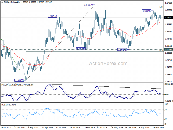 EUR/AUD remained bounded in consolidation from 1.5886 last week and outlook is unchanged. Initial bias stays neutral this week and more sideway trading could be seen. But after all, as long as 1.5651 minor support holds, further rise is expected. Break of 1.5888 resistance will extend rise from 1.5271 towards 1.6139/89 resistance zone. However, break of 1.5651 cluster support (38.2% retracement of 1.5271 to 1.5886 at 1.5651) will indicate near term reversal and turn bias back to the downside for 1.5271 low.