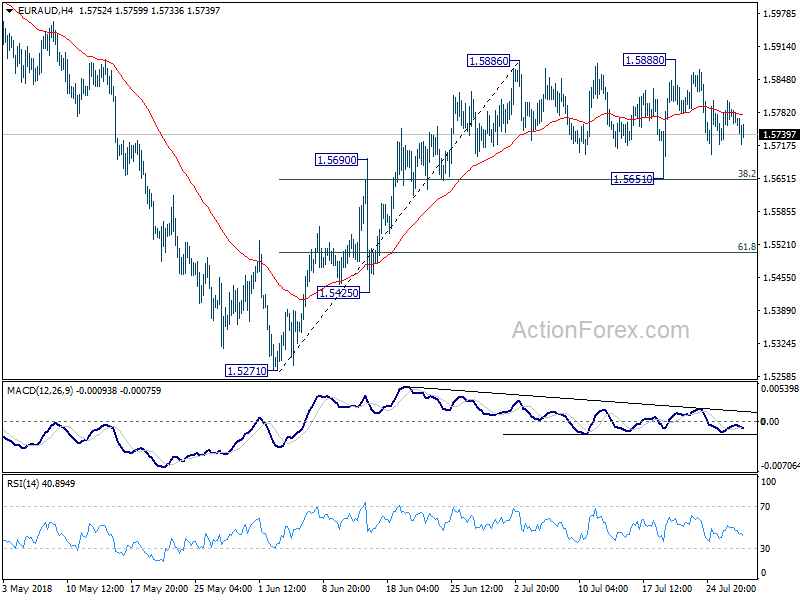 EUR/AUD remained bounded in consolidation from 1.5886 last week and outlook is unchanged. Initial bias stays neutral this week and more sideway trading could be seen. But after all, as long as 1.5651 minor support holds, further rise is expected. Break of 1.5888 resistance will extend rise from 1.5271 towards 1.6139/89 resistance zone. However, break of 1.5651 cluster support (38.2% retracement of 1.5271 to 1.5886 at 1.5651) will indicate near term reversal and turn bias back to the downside for 1.5271 low.