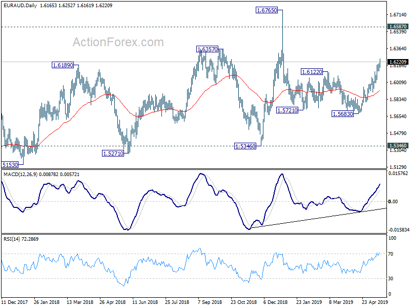 EUR/AUD surges to as high as 1.6252 so far and intraday bias remains on the upside. Corrective fall from 1.6765 has completed at 1.5683 already. Further rise should now be seen to retest 1.6765 high. On the downside, below 1.6127 minor support will turn intraday bias neutral and bring consolidation first, before staging another rally.