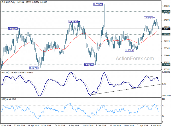 EUR/AUD’s correction form 1.6448 extended lower last week but outlook is unchanged. While further decline might be seen this week, downside should be contained above 1.6052 support to bring rise resumption. On the upside, break of 1.6448 will resume the rally from 1.5683 and target 1.6765 high. However, firm break of 1.6052 support will near term outlook bearish for 1.5683 support again.